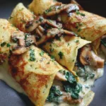 Delicate crêpes filled with tender chicken, earthy mushrooms, and fresh spinach, perfect for any occasion.