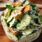 A refreshing salad with crunchy cucumbers, creamy dressing, and crispy tofu, perfect for hot summer days or as a quick side dish.