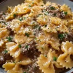 A comforting, creamy bowtie pasta with ground beef, garlic, and Parmesan cheese, perfect for a weeknight meal.