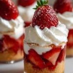 Delightful strawberry shortcake served in individual cups, featuring juicy strawberries, fluffy whipped cream, and soft cake.