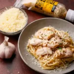 A comforting bowl of Garlic Parmesan Chicken Pasta, featuring tender shredded chicken, creamy garlic parmesan sauce, and perfectly cooked pasta for a savory weeknight meal.