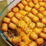 A comforting and easy dish that combines savory ground beef, vibrant vegetables, creamy mushroom soup, and crispy tater tots.