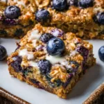 A warm and comforting baked oatmeal dish featuring wholesome rolled oats and vibrant blueberries, perfect for breakfast or brunch.