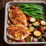 I make this Healthy Chicken Parmesan with Vegetables when I want a satisfying dinner that doesn’t derail the weeknight rhythm. It’s a lighter take on classic chicken parm: instead of frying and drowning in sauce, the chicken gets a crisp Parmesan-breadcrumb crust and roasts alongside seasoned red potatoes and green beans. The whole tray finishes in under an hour, which is why it’s become my go-to for busy evenings — and if your family likes familiar flavors with a vegetable boost, this one lands every time. If you enjoy simple, crowd-pleasing mains, you might also like this twist on a party favorite: buffalo chicken dip with cottage cheese.