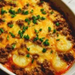 A comforting one-pan casserole featuring seasoned ground beef, thinly sliced potatoes, and a melty cheese topping, perfect for busy weeknights.