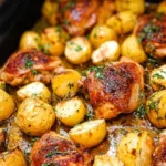 A comforting one-pan dish featuring juicy chicken thighs and tender potatoes, roasted to perfection.