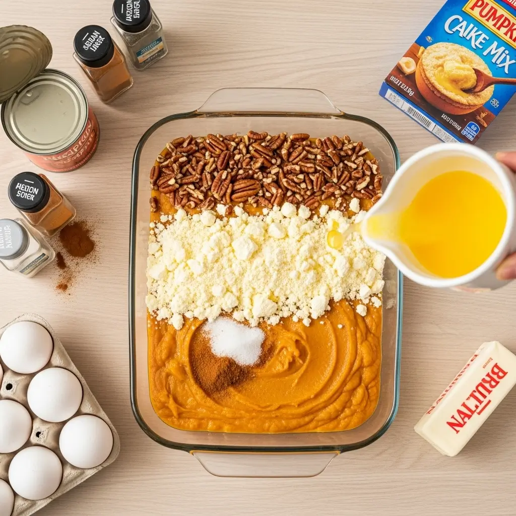 4. Sprinkle the yellow cake mix evenly over the pumpkin layer—do not stir.