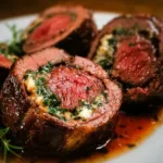 An impressive entrée featuring seared beef and a creamy filling of spinach, sun-dried tomatoes, and cheese, perfect for festive dinners.
